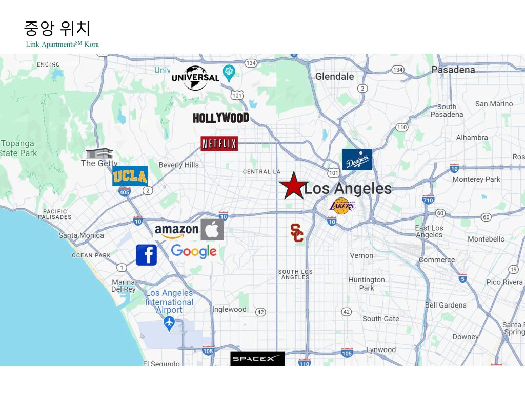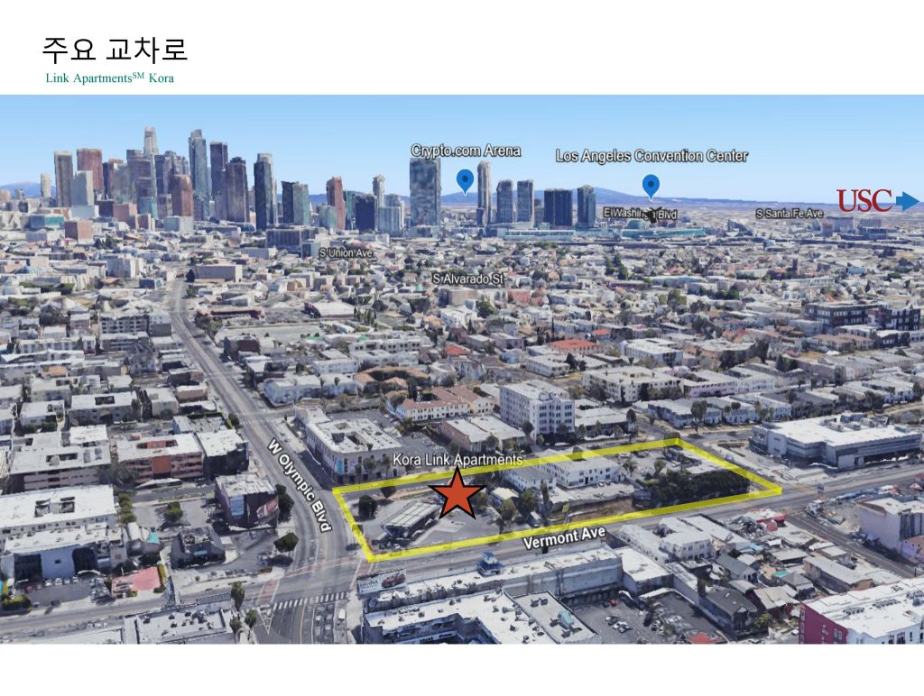 LA 코리아타운을 가로 지르는 가장 중요한 Olympic Blvd와 Vermont Ave 교차로에 위치